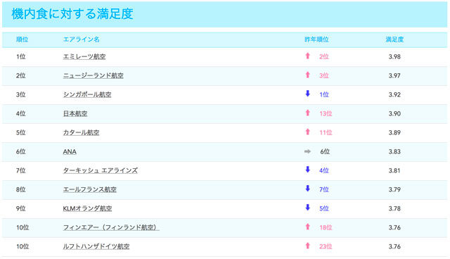 エイビーロードのエアライン満足度調査2017の機内食に対する満足度ランキング(同サイトから)