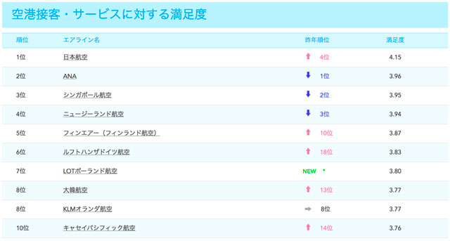 エイビーロードのエアライン満足度調査2017の空港接客・サービスに対する満足度ランキング(同サイトから)