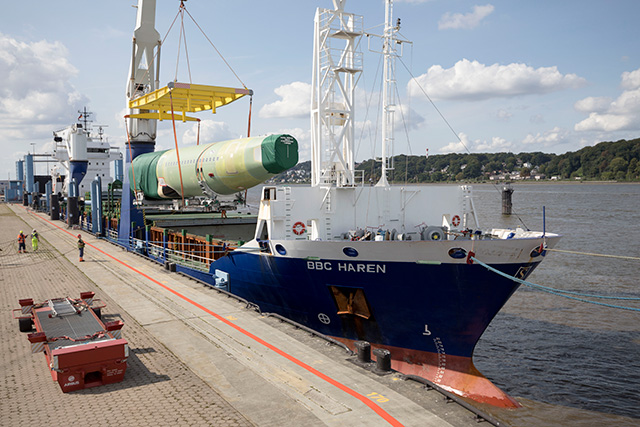 米国製50機目のA320胴体を積み込む貨物船=17年8月 PHOTO: Bengt Lange/Airbus
