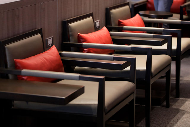 場所は出国エリア内の3階で、スペースを改修前と比べて約1.7倍に拡張するとともに内装を一新。席数は従来の33席から58席に増やし、ひとりあたりの居住空間を確保したという。