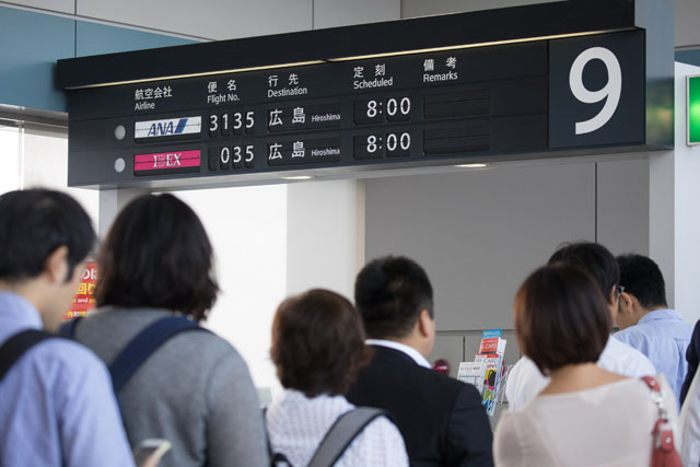 運航最終日を迎えたCRJ200の1便目となった仙台発広島行きFW35便の搭乗口に並ぶ乗客=17年9月27日 PHOTO: Tatsuyuki TAYAMA/Aviation Wire