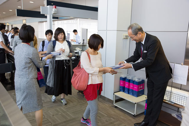 運航最終日を迎えたCRJ200による仙台発広島行きFW35便の乗客に記念品を手渡すIBEX社員=17年9月27日 PHOTO: Tatsuyuki TAYAMA/Aviation Wire