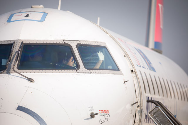 CRJ200のコックピットから手を振り合図するIBEXのパイロット=17年9月27日 PHOTO: Tatsuyuki TAYAMA/Aviation Wire