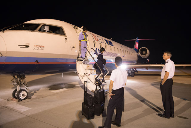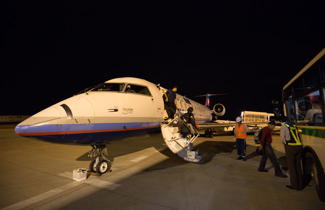 最終便の運航を終えたCRJ200 3号機から降機するIBEXのパイロットと客室乗務員=17年9月27日 PHOTO: Tatsuyuki TAYAMA/Aviation Wire