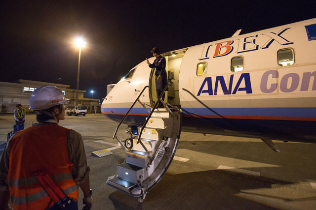 乗客の降機が完了しCRJ200からサインを送るIBEXの客室乗務員=17年9月27日 PHOTO: Tatsuyuki TAYAMA/Aviation Wire