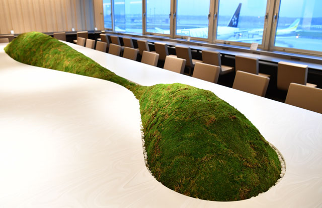 コケの山など天然素材を多用した新千歳空港のANAラウンジ=17年9月12日 PHOTO: Tadayuki YOSHIKAWA/Aviation Wire