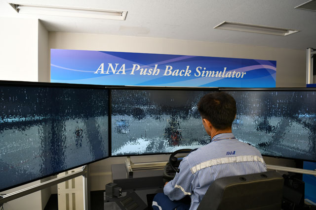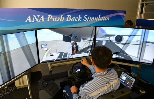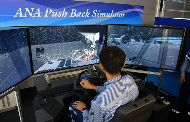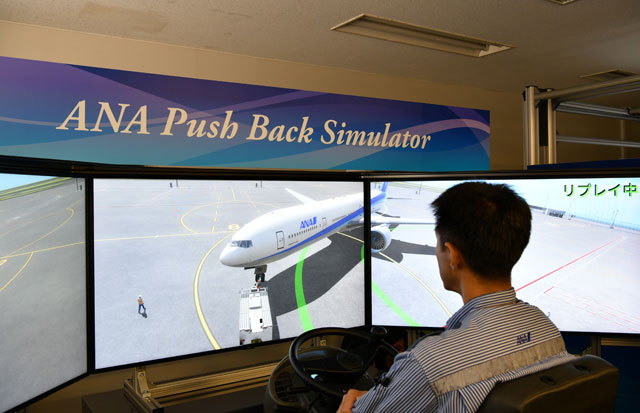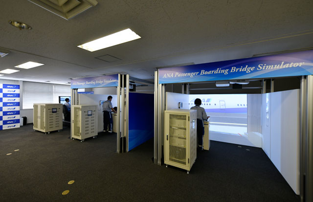 羽田の訓練施設には、プッシュバックのシミュレーターを1台、PBB用を2台導入。24時間運用で、新人が一人でも訓練できるようにカリキュラムやシミュレーターを開発した。 ANAエアポートサービスによると、プッシュバックのシミュレーターは海外にもあるが、PBB用は同社が調べた限り世界初だという。