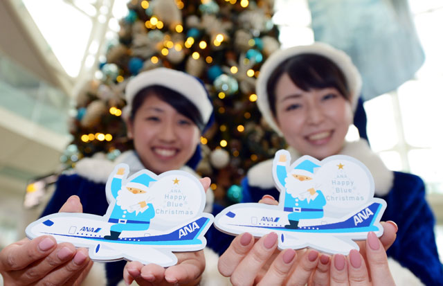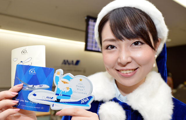 全日本空輸(ANA、9202)は12月25日までのクリスマス期間中、羽田空港で「ハッピー・ブルー・クリスマス」と題して青いコートに身を包んだ地上係員が出発客を出迎えている。