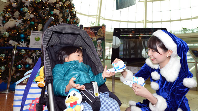 クリスマスを控えた23日は、国内線第2ターミナル中央に飾られた大型クリスマスツリー前で、“青いサンタクロース”が子どもたちにポストカードを配った。