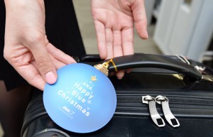 手荷物の受付でも、ブルー・クリスマスをイメージしたメッセージタグを用意。係員が乗客から手荷物を受け取った後、タグを付けていた。
