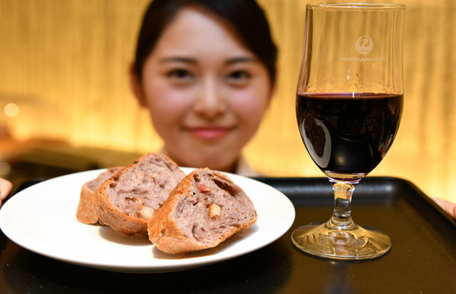 JALが羽田の国際線ファーストクラスラウンジで解禁と同時に提供したボジョレー・ヌーボーと特製パン「パン・オ・ボージョレー」=17年11月16日 PHOTO: Tadayuki YOSHIKAWA/Aviation Wire