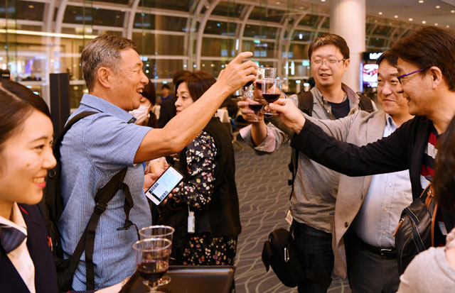 羽田国際線ターミナルの114番搭乗口前でJALの地上係員から手渡されたボジョレー・ヌーボーで乾杯する乗客たち=17年11月16日 PHOTO: Tadayuki YOSHIKAWA/Aviation Wire