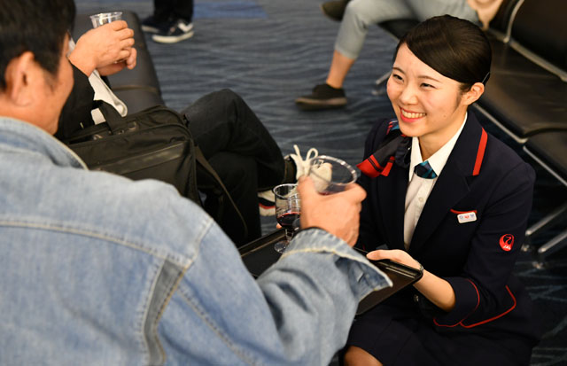 羽田国際線ターミナルの114番搭乗口前でボジョレー・ヌーボーを振る舞うJALの地上係員=17年11月16日 PHOTO: Tadayuki YOSHIKAWA/Aviation Wire
