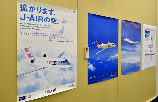 写真展は、ジェイエアの客室乗務員が訓練で使用する客室モックアップがある施設の1階で開催。CRJを操縦するジェイエアの酒井真比古機長が、JALから出向して4年間乗務の合間に撮り続けてきた写真を中心に展示したほか、就航当時のポスターやシートベルトなど、CRJゆかりの品々も並べられた。