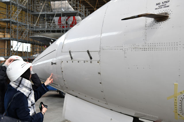 整備士の永原さんは、CRJの特徴である機体後部にあるエンジンに触れた。「エンジンの取り付け部分の組み替えが大変。右と左のエンジンで整備性が異なるんですよ」(永原さん)と、ほかの機体のように翼の下にエンジンが取り付けられている機体とは違った整備上の苦労話を披露した。