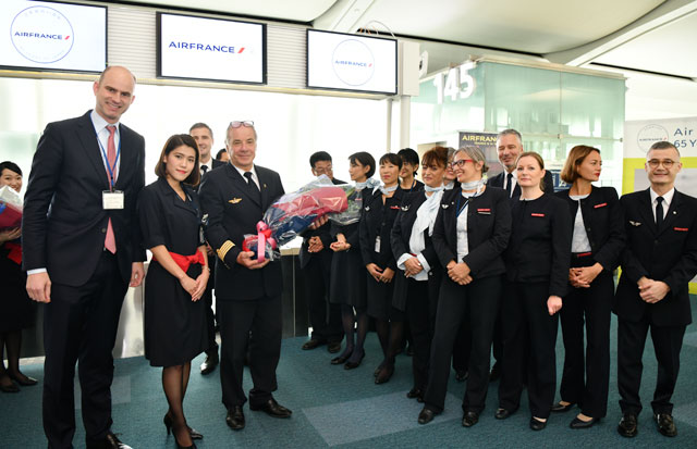 エールフランス日本就航65周年の花束を贈られたパリ行きAF279便の機長(左から3人目)をはじめとするクルーと関係者=17年11月27日 PHOTO: Tadayuki YOSHIKAWA/Aviation Wire
