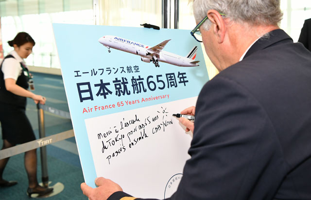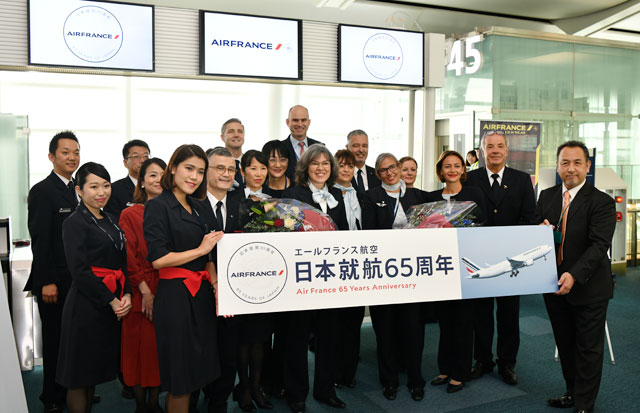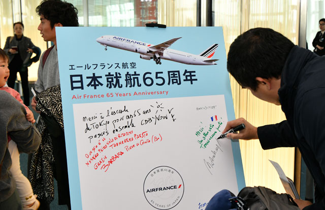 エールフランス航空(AFR/AF)は11月27日、日本就航65周年を迎えた。羽田空港では、パリ行きAF279便の乗客に記念品のチョコレートと搭乗証明書が手渡された。