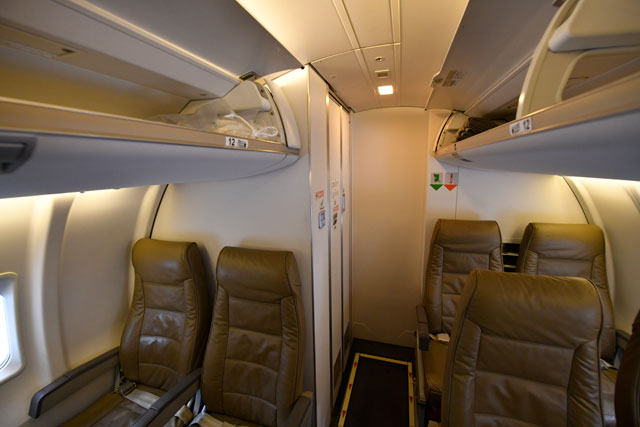 乗客は、乗降用ステップ(階段)となる前方左側ドアから機内に入る。このため、PBB(搭乗橋)がない空港でも運航できる。乗員の通常編成はパイロット2人と客室乗務員1人で、ギャレー(厨房設備)は前方右側1カ所、ラバトリー(化粧室)は後方右側1カ所と最小限で、非常口は前方右側ドアと中央両側にある。