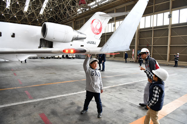 ジェイエアのCRJ200の主翼に触れる男の子たち。JALグループでもっとも小さいジェット機がまもなく退役する=17年11月26日 PHOTO: Tadayuki YOSHIKAWA/Aviation Wire