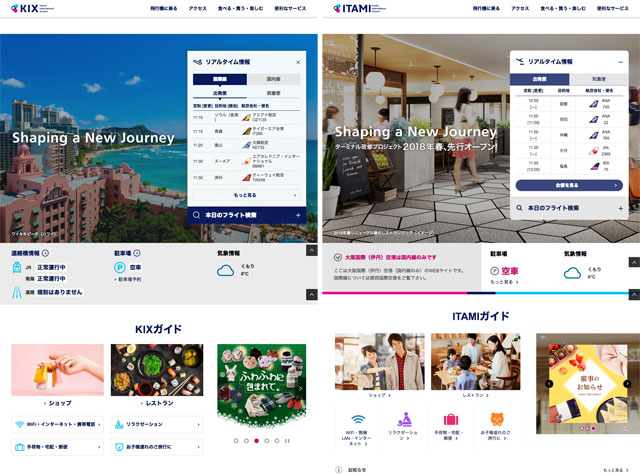 関西空港と伊丹空港を運営する関西エアポートは、両空港のウェブサイトを12月1日にリニューアルした。画面左上のロゴを除くと、両空港でほぼ同じデザイン採用した。