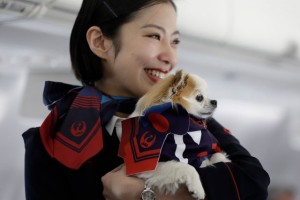 JALワンワンJETの機内で記念撮影用コスチュームを着た乗客のペットの犬を抱える客室乗務員=17年1月27日 PHOTO: Kiyoshi OTA/Aviation Wire