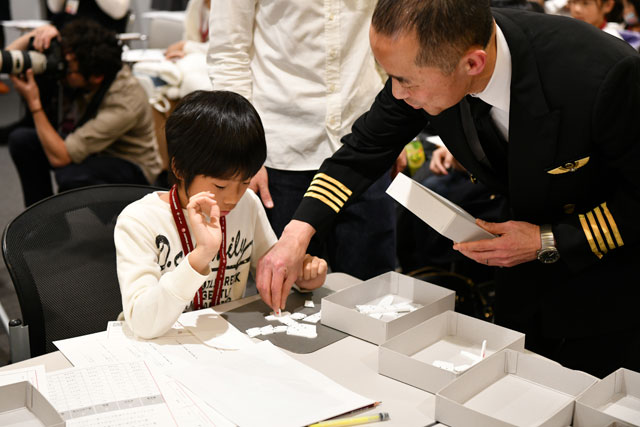 JAL STEAM SCHOOLで男の子にアドバイスする靏谷さん=PHOTO: Tadayuki YOSHIKAWA/Aviation Wire