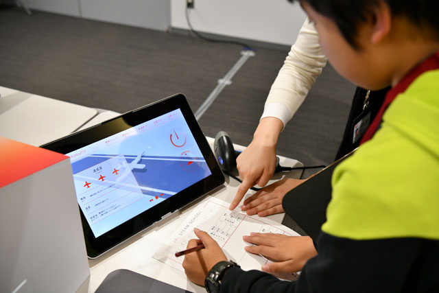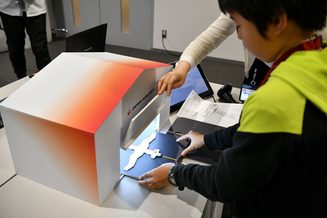 JAL STEAM SCHOOLでコンピューターが解析した機体の結果を確認する男の子=PHOTO: Tadayuki YOSHIKAWA/Aviation Wire