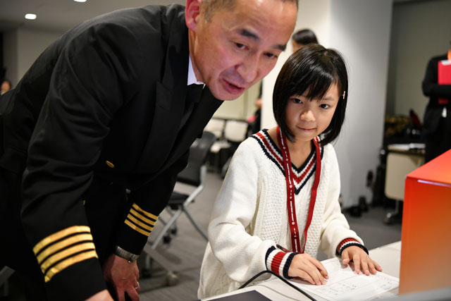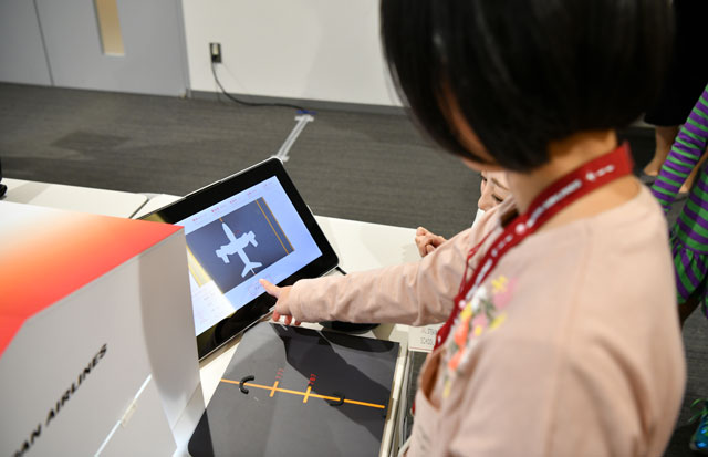 JAL STEAM SCHOOLで機体のコンピューター解析をスタートさせる女の子=PHOTO: Tadayuki YOSHIKAWA/Aviation Wire