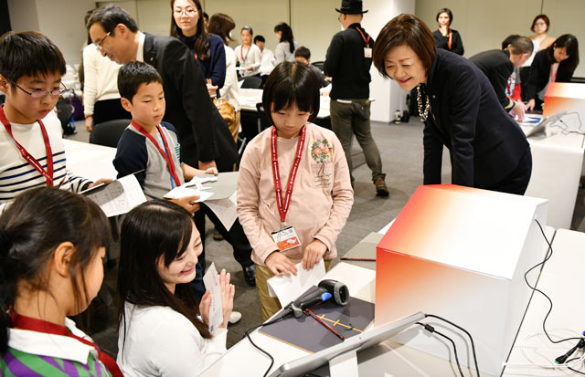 子供たちが作った翼の形状を見た阿部さんは、「翼と翼を重ねるなど、私たちが考えないようなことを、すぐにやっていましたね。組立教材を企画した段階では、翼の組み合わせは数千通りと考えていたのですが、今日できたものには初めて目にした形もあり、何万通りかもしれない」と喜ぶ。
