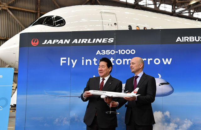 A350について、JALの植木義晴社長は、「エアバスの本拠地であるトゥールーズで、実際に触れて匂いまで嗅いでこれだな、と確信を持って選定した」と導入の経緯を振り返った。「初期故障がほとんど見られず、選定して良かった。(機内仕様について)社内で意見を公募しており、社員の夢と希望を基に、最高の飛行機に仕上げてお客様に喜んでいただけるよう、努力したい」(植木社長)と語った。