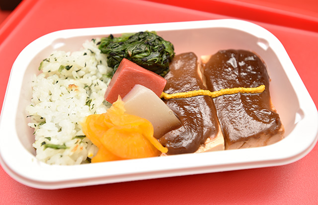 豆腐とごはんのほか、ホウレンソウの胡麻和えと赤白のコンニャク含め煮も添える。肉類を使用していないため、ベジタリアンも食べることができる。260キロカロリー。事前予約した場合は750円で、機内では850円で販売する。