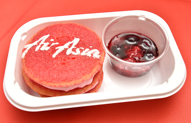 エアアジアのロゴをデザインした機内食「REDパンケーキ」=18年3月8日 PHOTO: Yusuke KOHASE/Aviation Wire