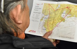 FDAのチャーター便JH1212便のルートマップを見る参加者=18年3月17日 PHOTO: Yusuke KOHASE/Aviation Wire