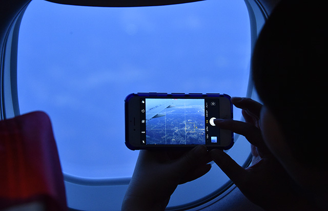 FDAのチャーター便JH1212便から景色を撮影する参加者=18年3月17日 PHOTO: Yusuke KOHASE/Aviation Wire