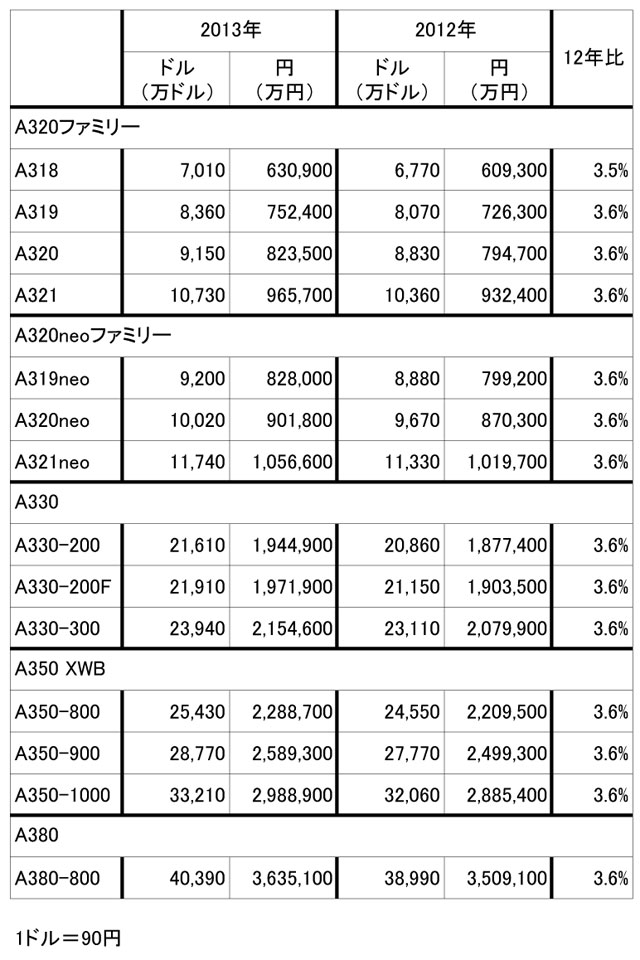 エアバスの13年版(左)と12年版の航空機価格(エアバスの資料からAviation Wire作成)
