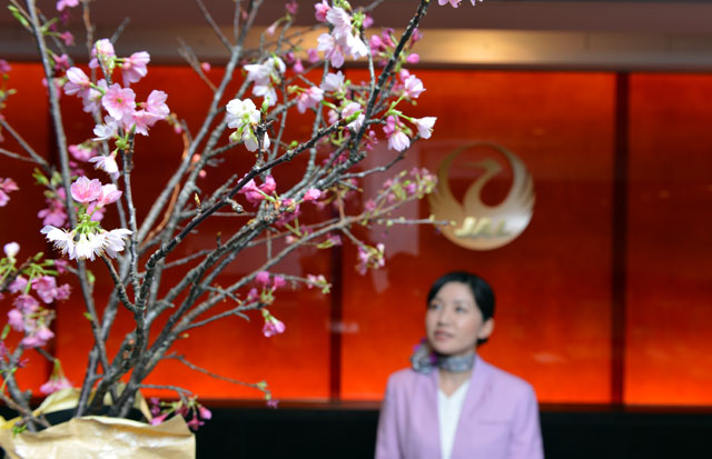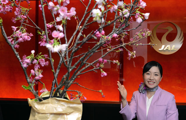 日航、日本一早い桜を羽田ラウンジに展示