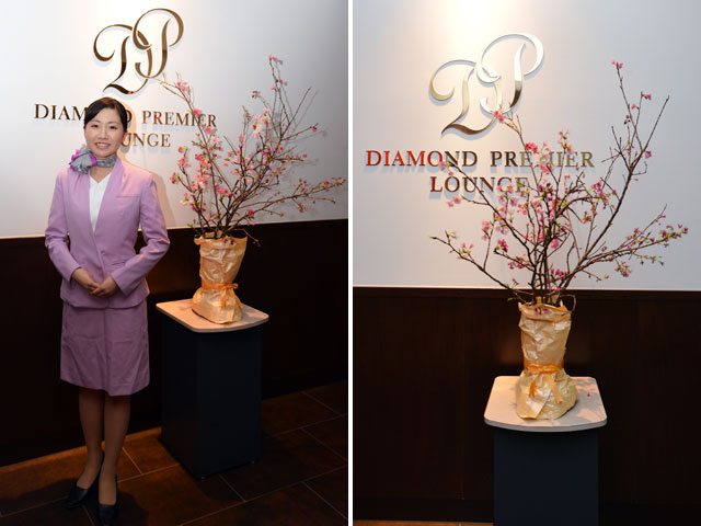 今年で19回目を迎えた桜の切り花の展示。桜色の制服を着用したスタッフがいるラウンジでの開催は、今回が最後となる予定だ。ラウンジスタッフの制服は、2013年上期からは客室乗務員に近い、紺を基調としたデザインに切り替わる。