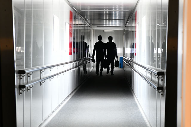 羽田に到着し福岡発012便から降機した髙橋機長(右)とベヒシュタイン副操縦士=18年4月6日 PHOTO: Tadayuki YOSHIKAWA/Aviation Wire