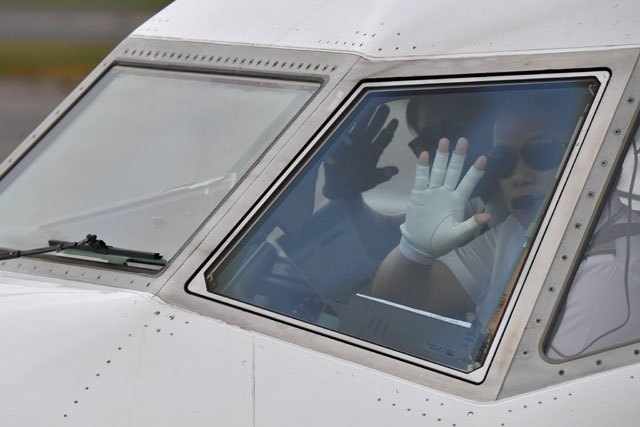 羽田発福岡行きBC009便のコックピットから手を振る髙橋機長(手前)とベヒシュタイン副操縦士=18年4月6日 PHOTO: Tadayuki YOSHIKAWA/Aviation Wire