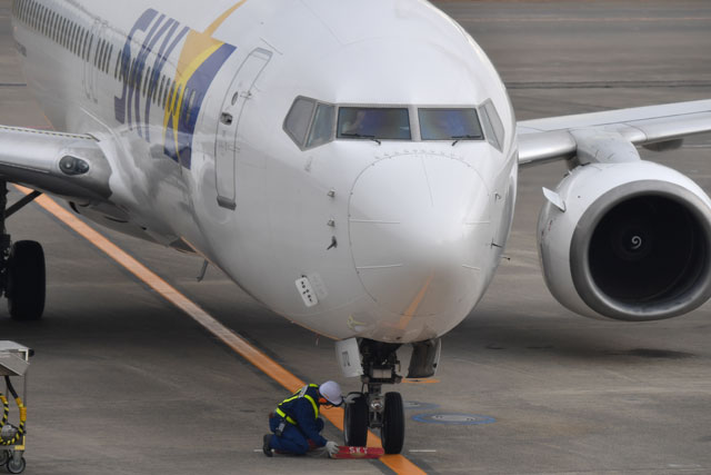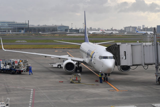 髙橋機長とベヒシュタイン副操縦士が乗務し羽田に到着したスカイマークの福岡発012便=18年4月6日 PHOTO: Tadayuki YOSHIKAWA/Aviation Wire
