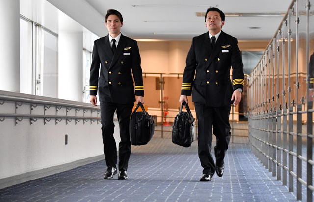 福岡行きBC009便に向かう髙橋機長とベヒシュタイン副操縦士=18年4月6日 PHOTO: Tadayuki YOSHIKAWA/Aviation Wire
