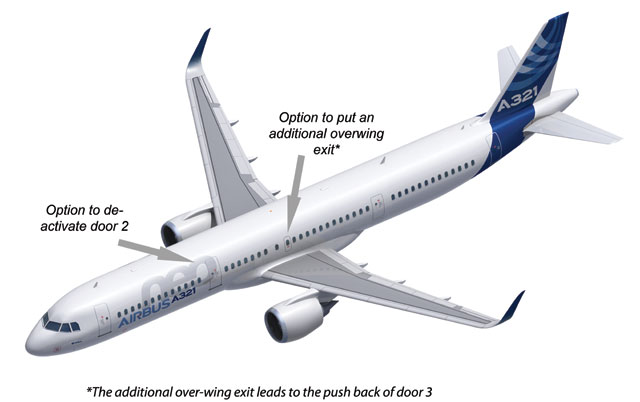 新オプションでは主翼上部の位置に非常口ドアを追加することで座席数の上限を拡大。このオプションに加え、ラバトリー(化粧室)の配置を変更することで客室後部スペースを有効活用する客室レイアウト「Space-Flex」を導入することで従来の最大座席数220席に16席を追加し、最大236席を備えることが可能になった。エアバスによると、シートマイルコストを約5%削減できるという。