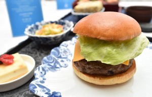 KLMのビジネスクラス新サービス「Anytime For You」で提供するチーズバーガー=18年4月19日 PHOTO: Yusuke KOHASE/Aviation Wire