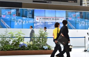 JALの成田就航40周年記念ビデオを放映する第2ターミナル保安検査場前の大型スクリーン=18年5月22日 PHOTO: Yusuke KOHASE/Aviation Wire