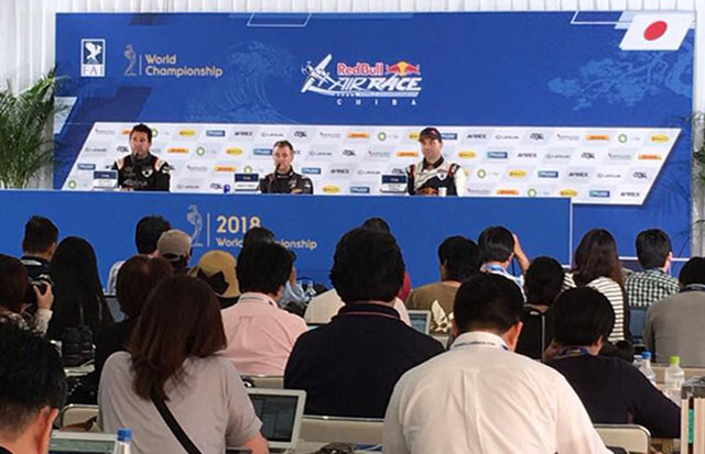 レッドブル・エアレース千葉大会決勝戦後に開かれた記者会見に出席するホール選手(中央)ら=18年5月27日 PHOTO: Sho KOSHIJIMA/Aviation Wire