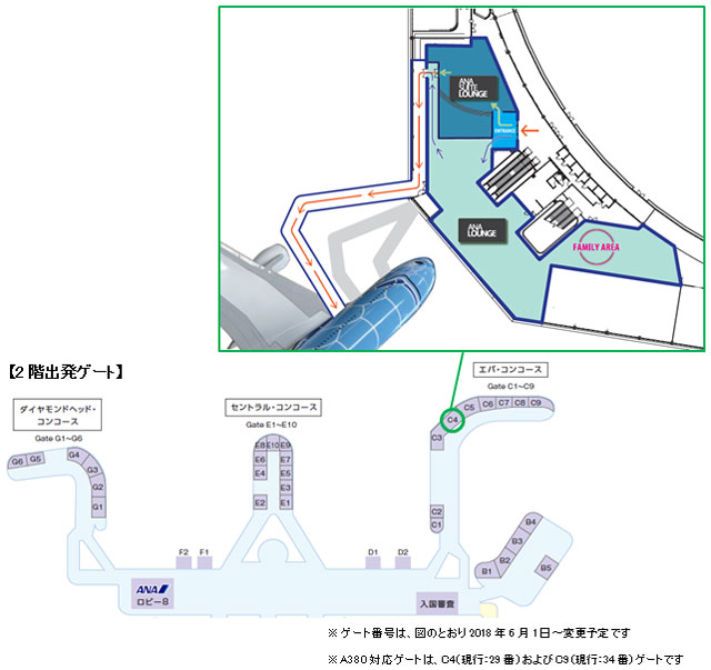 自社ラウンジは、ターミナル2(5月31日まではメインターミナル)の3階、エバ・コンコースにあるC4(同29番)搭乗口上に新設。ファーストクラスの乗客やマイレージサービス最上級会員用の「ANAスイートラウンジ」と、ビジネスクラス客などが使える「ANAラウンジ」を設ける。