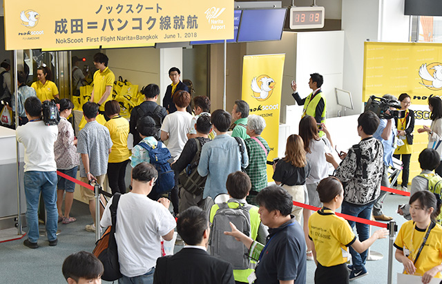 成田空港でノックスクートのバンコク行きXW101便初便に搭乗する乗客=18年6月1日 PHOTO: Yusuke KOHASE/Aviation Wire