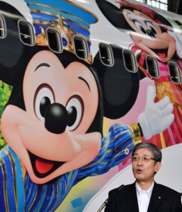 機内では、専用ヘッドレストカバーや紙コップなどを用意し、希望者には搭乗証明書を配る。JALの赤坂祐二社長は、「ミッキーマウス