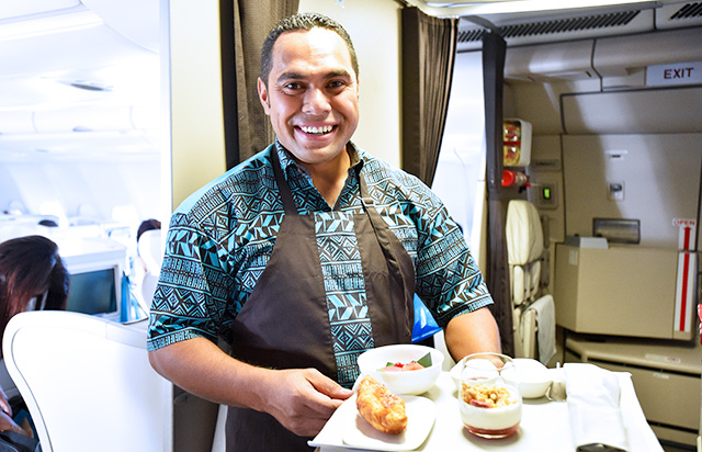 FJ350便のビジネスクラスで朝食を用意するフィジー・エアウェイズの客室乗務員=18年7月4日 PHOTO: Yusuke KOHASE/Aviation Wire