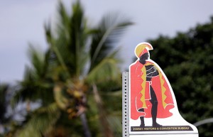 カメハメハ大王をデザインしたハワイ州観光局のサイン=18年8月22日 PHOTO: Kiyoshi OTA/Aviation Wire